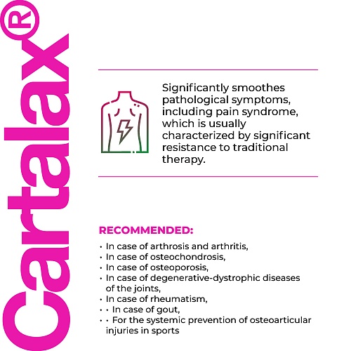 Die Wirksamkeit von Cartalax lingual Nahrungsergänzungsmittel wurde in klinischen Studien bei der komplexen Behandlung von Patienten mit Osteochondrose der Wirbelsäule, Osteoarthritis, Osteoporose, nach Verletzungen und Frakturen sowie bei der Vorbeugung von sklerotischen und degenerative Prozesse an Wirbelsäule und Gelenken bei älteren und senilen Menschen.