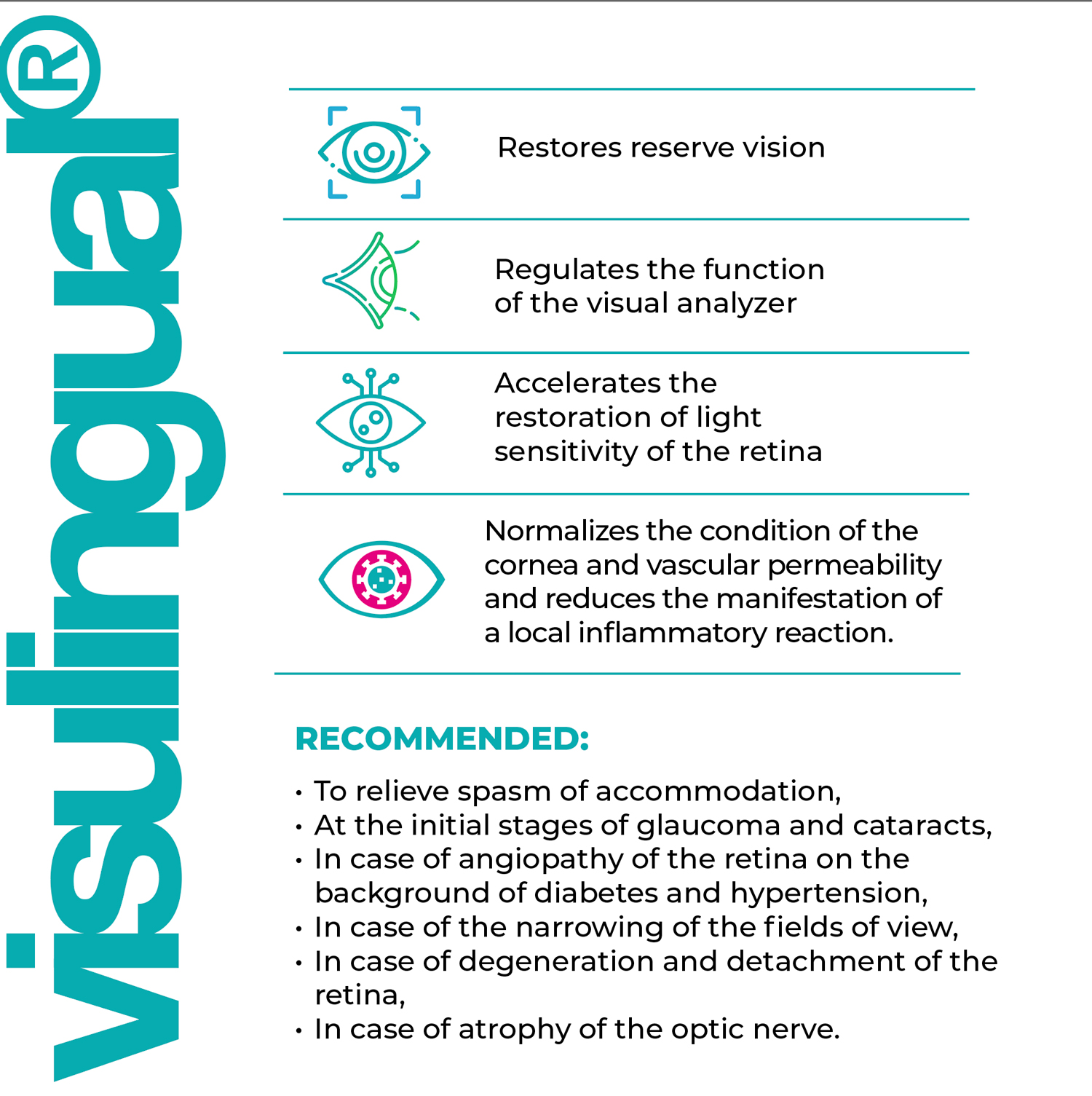 In klinischen Studien wurde die mögliche Wirksamkeit von visulingualem lingualem Nahrungsergänzungsmittel zur komplexen Wiederherstellung der Funktionen der Sehorgane bei Erkrankungen verschiedener Genese, einschließlich degenerativ-dystrophischer, pathologischer Zustände, die zu Sehstörungen führen, nachgewiesen Beeinträchtigung, bei extremen Umweltfaktoren, einschließlich aller notwendigen beruflichen, Mangelernährung und Alterung.