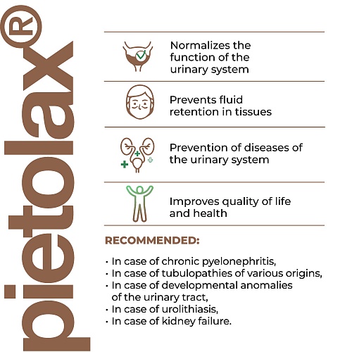 Die Wirksamkeit von "Pielotax" wurde in klinischen Studien bestätigt. Es ist wirksam zur komplexen Wiederherstellung der Nierenfunktion bei Nephropathien unterschiedlicher Genese und zur Optimierung der Funktion des Harnsystems. Es hilft auch bei der Bewältigung des Einflusses extremer Umweltfaktoren, Unterernährung und ist wirksam beim Altern.