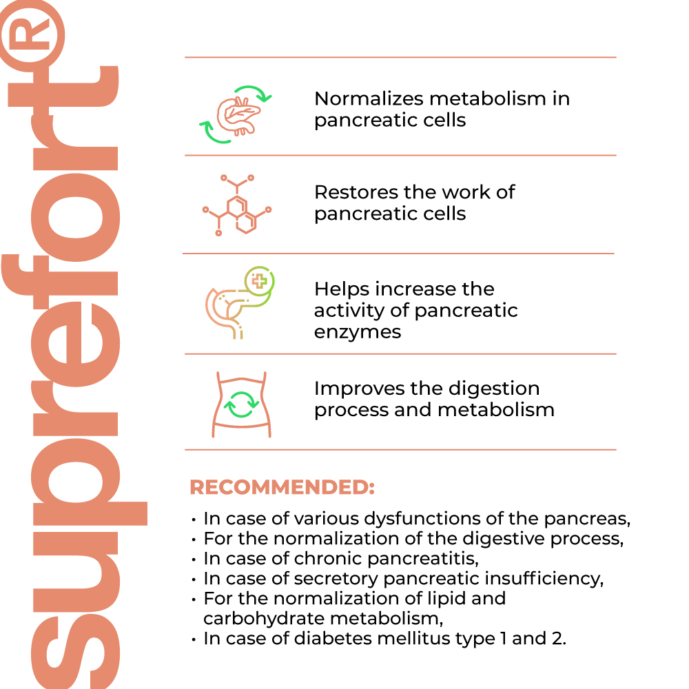 Die Wirksamkeit von "Suprefort" wurde in klinischen Studien bestätigt. Es ist wirksam für die komplexe Wiederherstellung der Pankreasfunktionen nach Pankreaserkrankungen unterschiedlicher Genese. Dazu gehören pathologische Zustände, die zu Funktionsstörungen der Bauchspeicheldrüse führen, Einfluss extremer Umweltfaktoren, Unterernährung und Alterung.
