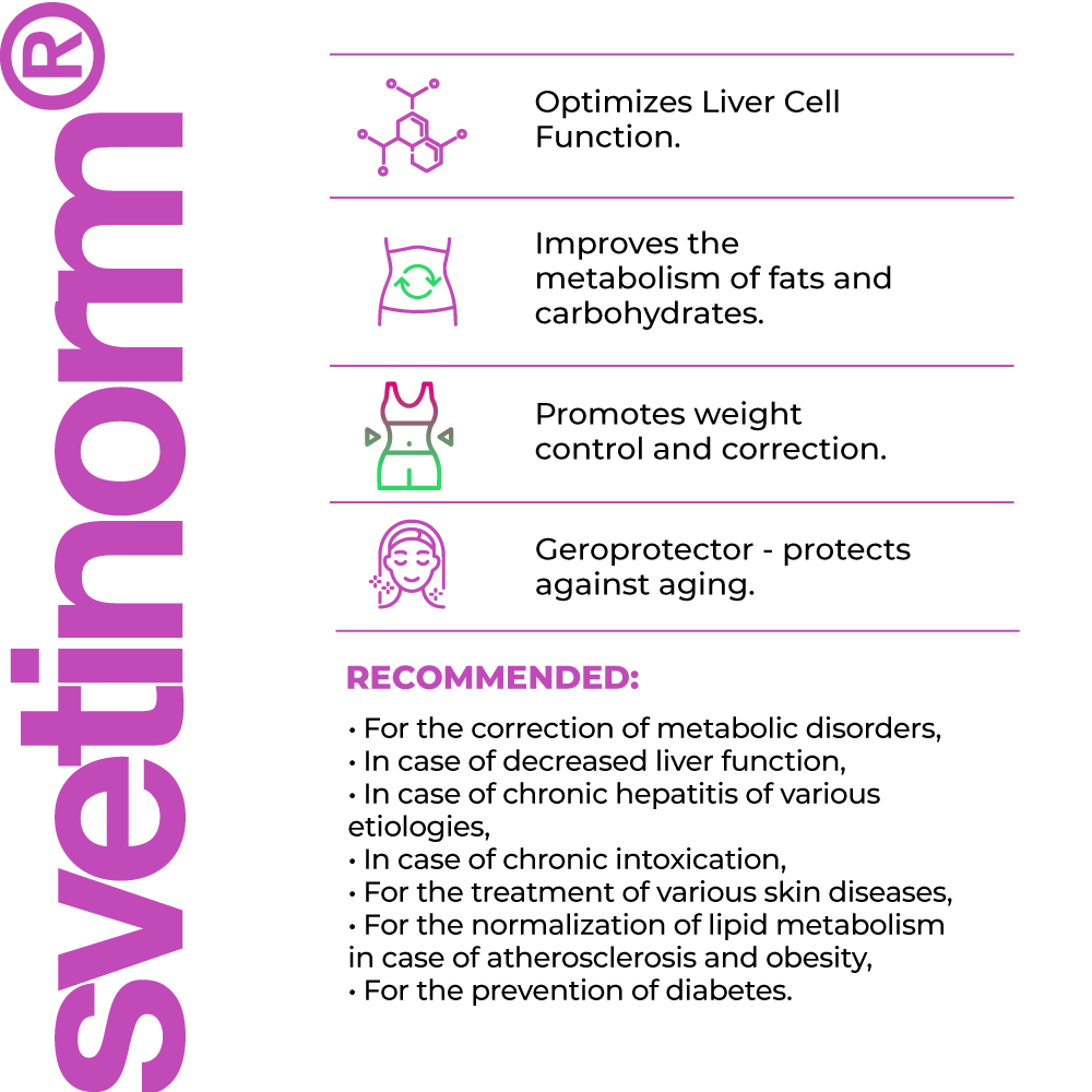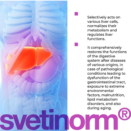 Die Wirksamkeit von „Svetinorm“ wurde in klinischen Studien bestätigt. Es ist wirksam zur komplexen Wiederherstellung der Funktionen des Magen-Darm-Traktes nach Erkrankungen verschiedener Genese, bei pathologischen Zuständen, die zu Funktionsstörungen des Verdauungstraktes führen, bei Einfluss extremer Umweltfaktoren, Mangelernährung, Störung des Fettstoffwechsels und auch im Alter.