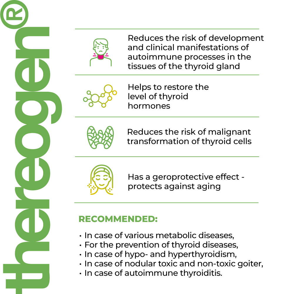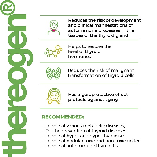 Die Wirksamkeit von "Thyreogen" Nahrungsergänzungsmittel wurde in klinischen Studien definiert. Es ist wirksam für die komplexe Wiederherstellung der Schilddrüsenfunktionen nach Krankheiten verschiedener Genese, bei pathologischen Zuständen, die zu einer Verletzung der Schilddrüsenfunktionen führen, dem Einfluss äußerer Umweltextremfaktoren, Unterernährung, beim Altern und auch während des Lebens in einem Gebiet, das für Krankheiten endemisch ist der Schilddrüse.
