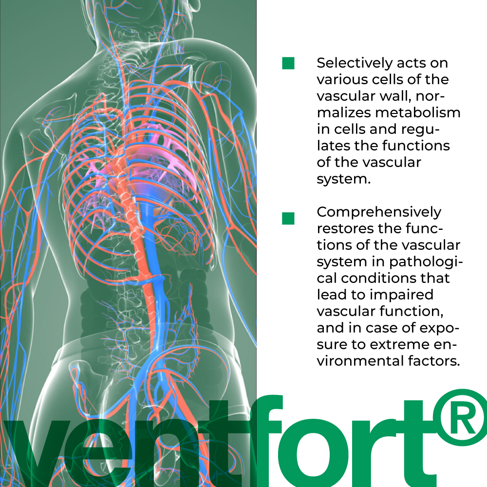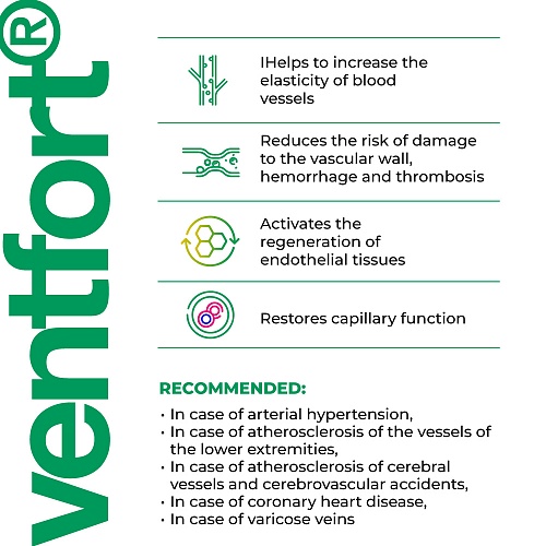 Die Wirksamkeit von "Ventfort" wurde in klinischen Studien bestätigt. Es ist wirksam für die komplexe Wiederherstellung der Funktionen des Gefäßsystems nach Krankheiten verschiedener Genese. Dazu gehören pathologische Zustände, die zu Störungen der Gefäßfunktionen führen, der Einfluss extremer Umweltfaktoren, Mangelernährung, Störungen des Fettstoffwechsels und Alterung.