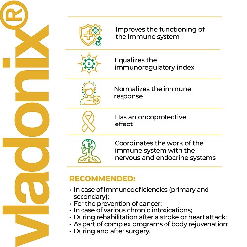Die Wirksamkeit von "Vladonix" wurde in klinischen Studien bestätigt. Es ist wirksam für die komplexe Wiederherstellung der Immunität nach Krankheiten verschiedener Genese. Dazu gehören pathologische Zustände, die zur Störung der Funktionen des Immunsystems führen, Einfluss extremer Umweltfaktoren, Mangelernährung und Alterung.