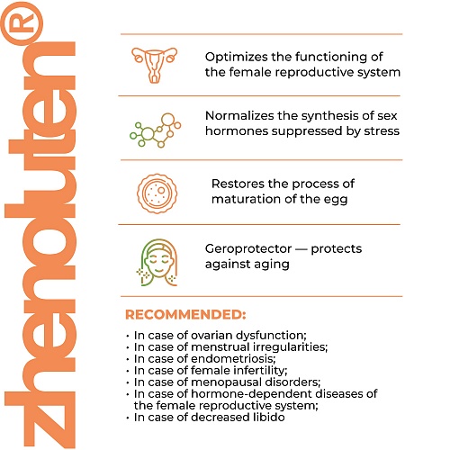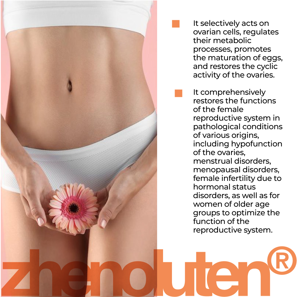Die Wirksamkeit von "Zhenoluten" wurde in klinischen Studien bestätigt. Es ist wirksam für die komplexe Wiederherstellung der Funktion des weiblichen Fortpflanzungssystems bei pathologischen Zuständen verschiedener Genese. Dies umfasst eine Unterfunktion der Eierstöcke, Störungen des Menstruationszyklus, klimakterische Frustration, weibliche Unfruchtbarkeit, die durch Störungen des Hormonstatus verursacht wird, und ist für Frauen in höheren Altersgruppen zur Optimierung der Funktion des Fortpflanzungssystems wirksam.