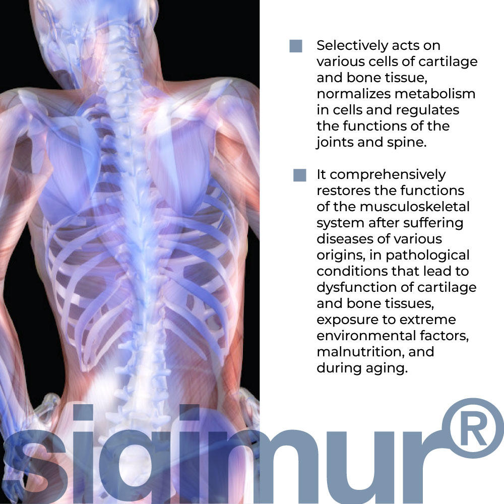 Die Wirksamkeit von Sigumir lingual Nahrungsergänzungsmittel wurde in klinischen Studien bestimmt. Es ist wirksam für die komplexe Wiederherstellung der Funktionen des Stütz- und Bewegungssystems nach Krankheiten verschiedener Genese, bei pathologischen Zuständen, die zu einer Verletzung der Funktionen des Knorpel- und Knochengewebes führen, dem Einfluss äußerer Umweltextremfaktoren, Unterernährung und auch beim Altern.