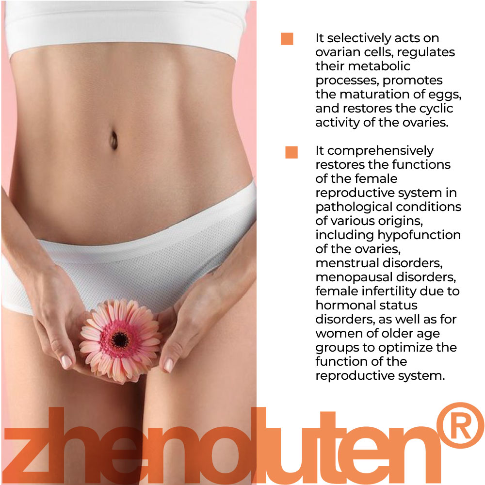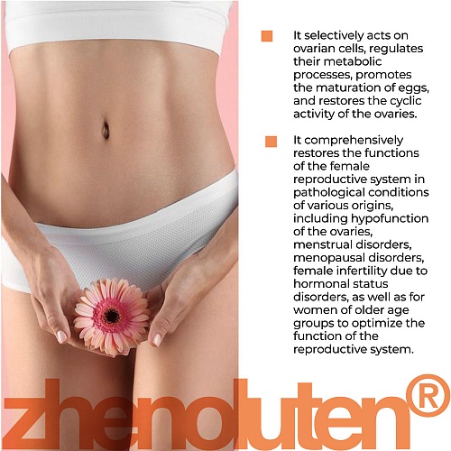 Die Wirksamkeit von Zhenoluten lingual Nahrungsergänzungsmittel wurde in klinischen Studien bestimmt. Es ist wirksam für die komplexe Wiederherstellung der Funktion des weiblichen Fortpflanzungssystems bei pathologischen Zuständen verschiedener Genese, einschließlich Unterfunktion der Eierstöcke, Verletzung des Menstruationszyklus, klimakterischer Frustration, weiblicher Unfruchtbarkeit, die durch Verletzungen des Hormonstatus verursacht wird, und auch für Frauen in höheren Altersgruppen Optimierung der Funktion des Fortpflanzungssystems.