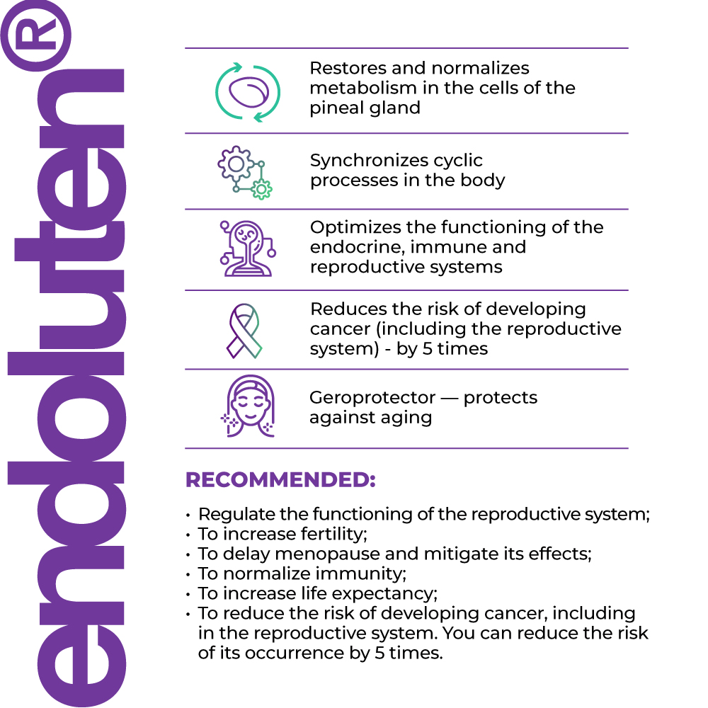 'Endoluten' wird die Melatoninsynthese bis zu physiologisch optimalen Größen des gesunden Organismus aktiver. Nahrungsergänzungsmittel stellen die Synthese von endogenem Melatonin wieder her. Epiphysenpeptide, die in 'Endoluten' enthalten sind, sind identisch mit denen, die ein gesunder menschlicher Körper entwickelt, und aus diesem Grund sind weder eine Überdosierung noch Nebenwirkungen während der Einnahme möglich. Es wurde durch langfristige klinische Forschungen bestätigt. 'Endoluten' stellt die Produktion von Melatonin nur auf die physiologische Norm wieder her, hat eine bioregulierende Wirkung und gleicht lebenswichtige Prozesse im menschlichen Körper aus.