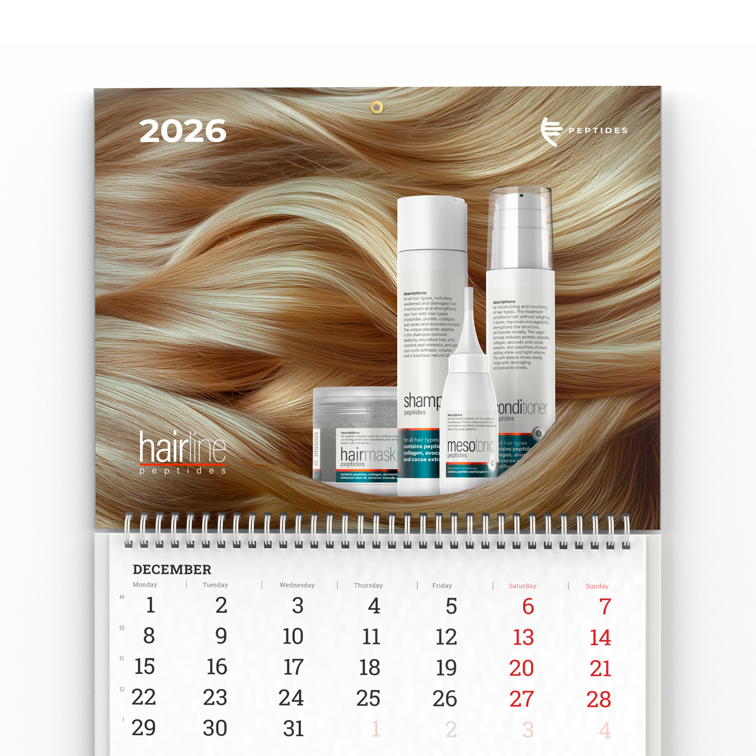 Dieser lebendige Kalender im unverkennbaren Stil von Peptides ist nicht nur ein praktisches Planungstool, sondern auch ein stilvolles Element Ihres Arbeitsplatzes. Das Design des Kalenders wurde mit besonderer Liebe zum Detail gestaltet und spiegelt die Kernwerte des Unternehmens wider — Innovation, Harmonie, Gesundheit und Schönheit. Die Farbpalette und die Designelemente symbolisieren die Einheit der Produkte, die Ihr Wohlbefinden und Ihr inneres Gleichgewicht unterstützen sollen.